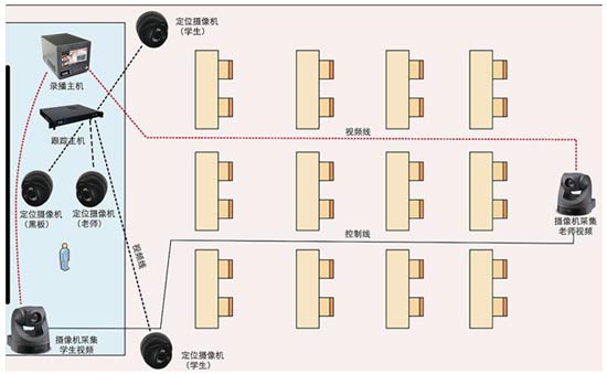錄播教室安裝2個(gè)電視機(jī),分別供教師及學(xué)生收看,無(wú)互動(dòng)時(shí)供教師觀看的顯示屏?xí)示艑m格狀態(tài)顯示所有遠(yuǎn)程教室信號(hào)。當(dāng)遠(yuǎn)程端的學(xué)生向錄播教室端的老師提出問(wèn)題時(shí),教師通過(guò)遙控器選擇該教室,通過(guò)攝像機(jī)和聲音采集設(shè)備將采集到的學(xué)生視音頻傳輸?shù)戒洸ソ淌绎@示器上,該信號(hào)將會(huì)輸出到錄播教室學(xué)生收看的屏幕上,此時(shí)學(xué)生會(huì)看到遠(yuǎn)程教室中學(xué)生提問(wèn)的互動(dòng)場(chǎng)景,實(shí)現(xiàn)遠(yuǎn)程互動(dòng)教學(xué)。