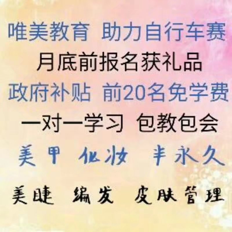 驚喜 驚喜 特大驚喜 唯美教育學校為迎接 邢臺自行車賽 特為愛美人士重推出以下助學活動: 凡在活動期間外地需住宿學習的學員報名,即可獲得免住宿費1 個月 凡在活動期間報名學習的寶媽,均可為自己親愛的寶寶獲得超級可愛書包1 個 凡在活動期間報名學習的單身女孩或已婚但未當寶媽學員,可獲得超級大超級可愛的1.6米泰迪熊或1.6米瞌睡熊毛絨玩具1 個(每個均有7 個顏色可選哦) 活動時間:2017 年8 月11 日——2017年8 月31 日 只要你愛美 只要你愛好 只要你愛學 只要你喜歡 那麼就不要再猶豫了 機會不多,失不再來 心動不如行動,趕緊行動吧