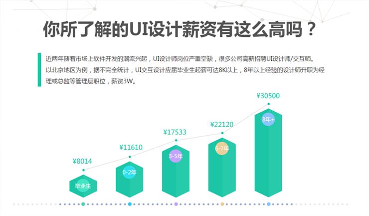你所了解的UI設(shè)計(jì)薪資有這么高嗎?近兩年隨著市場上軟件開發(fā)的潮流興起,UI設(shè)計(jì)師崗位嚴(yán)重空缺,很多公司高薪招聘UI設(shè)計(jì)師/交互師。以北京地區(qū)為例,據(jù)不完全統(tǒng)計(jì),UI交互設(shè)計(jì)應(yīng)屆畢業(yè)生起薪可達(dá)8K以上,8年以上經(jīng)驗(yàn)的設(shè)計(jì)師升職為經(jīng)理或總監(jiān)等管理層職位,薪資3W。