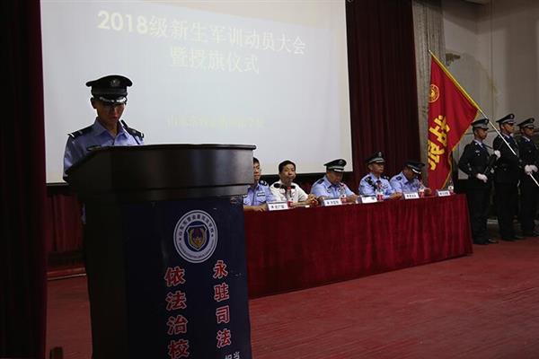 山東東營(yíng)金盾司法學(xué)校楊萬(wàn)里校長(zhǎng)作出軍訓(xùn)動(dòng)員講話并為“戰(zhàn)狼”、“戰(zhàn)虎”、“戰(zhàn)神”軍訓(xùn)隊(duì)伍授旗。他深情的說(shuō):“軍訓(xùn)是同學(xué)們學(xué)習(xí)軍隊(duì)優(yōu)良傳統(tǒng)、培養(yǎng)艱苦奮斗精神的極好機(jī)會(huì),也是大家磨練意志、提高修養(yǎng)、增強(qiáng)體質(zhì)的實(shí)踐課堂。