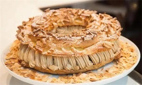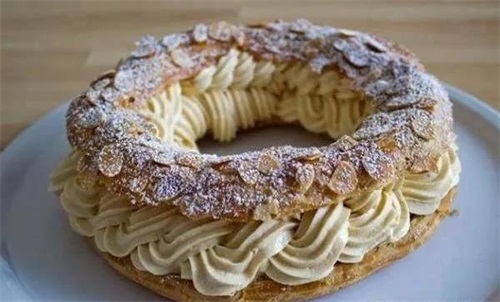 巴黎布雷斯特車輪泡芙是有名的法國(guó)糕點(diǎn),外形似車輪狀,由嵌入摻以糖杏仁屑細(xì)奶油的泡芙,并撒滿杏仁碎而成。