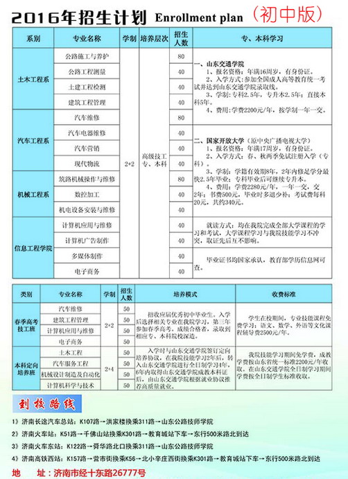 山東公路技師學(xué)院簡(jiǎn)介 山東公路技師學(xué)院直屬于山東省交通運(yùn)輸廳,是一所以培養(yǎng)交通行業(yè)高技能人才為主,集職工培訓(xùn)、成人教育、技能鑒定、駕駛培訓(xùn)和智慧交通技術(shù)應(yīng)用與試驗(yàn)于一體的綜合性公辦全日制技師學(xué)院。 學(xué)院目前兩地三區(qū)辦學(xué),主校區(qū)、無影山校區(qū)和德州校區(qū),其中主校區(qū)坐落在濟(jì)南市經(jīng)十東路,交通便利,設(shè)施設(shè)備先進(jìn)齊全,環(huán)境優(yōu)美??傉嫉孛娣e700余畝,建筑面積16萬平方米,現(xiàn)有教職工300余人,在校生達(dá)12000余人。學(xué)院設(shè)有公路工程系、運(yùn)輸工程系、汽車工程系、智能控制系、信息與管理工程系、基礎(chǔ)部、智慧交通技術(shù)應(yīng)用與試驗(yàn)中心五系一部一中心,常設(shè)專業(yè)37個(gè)。 學(xué)院19..