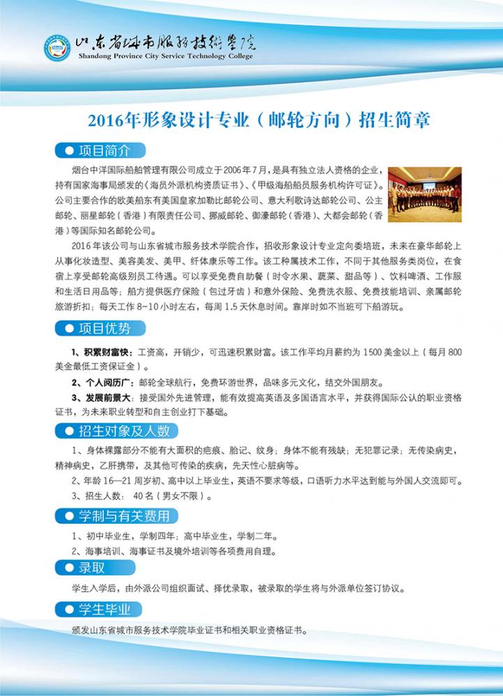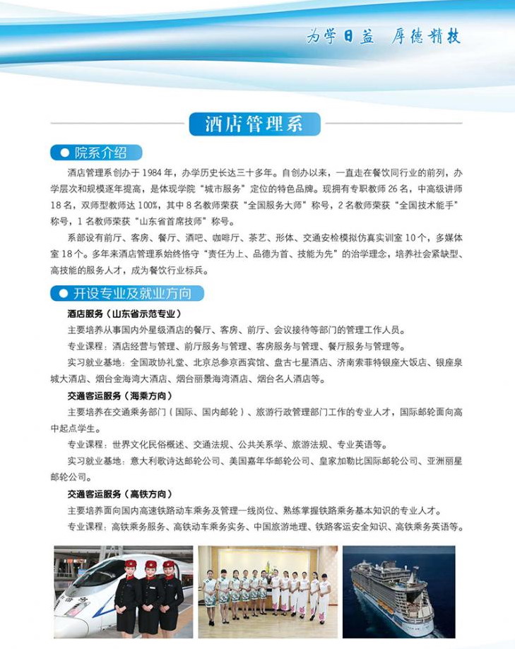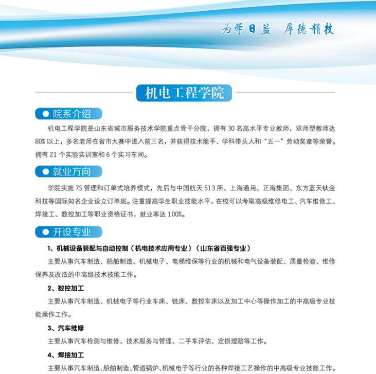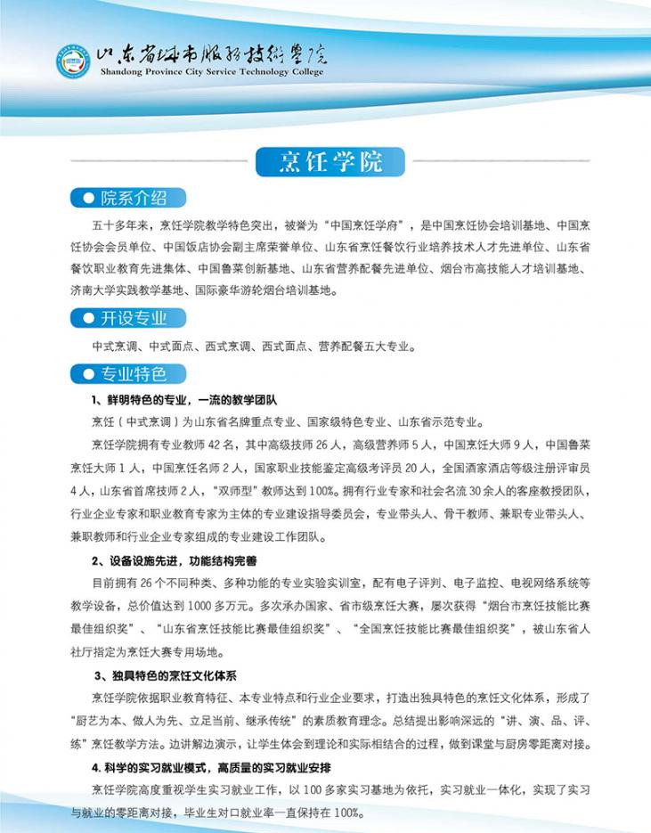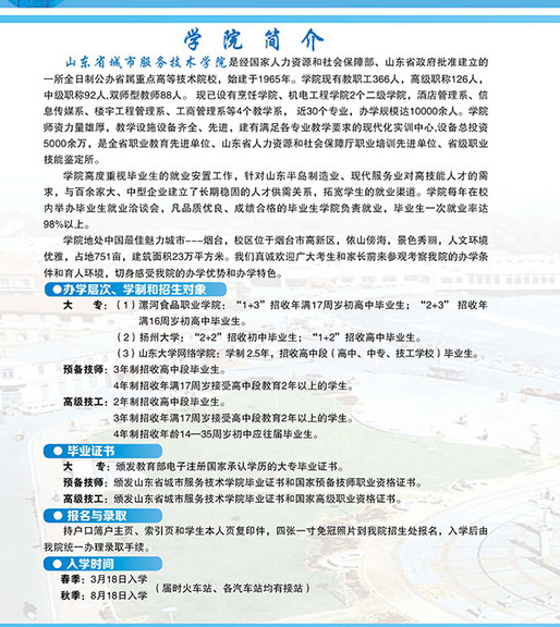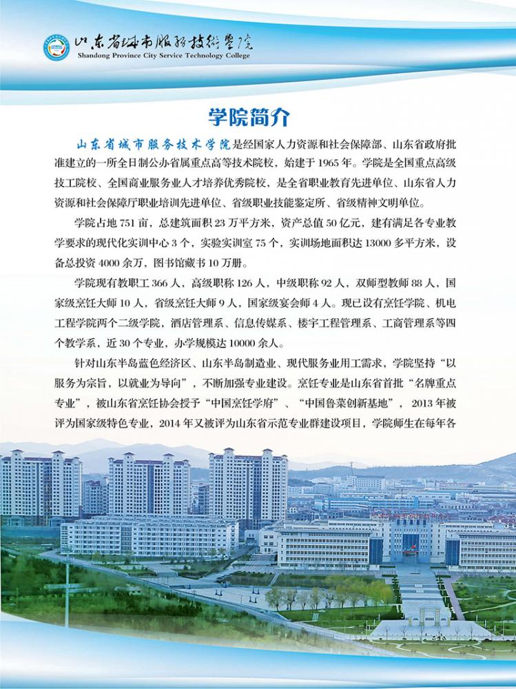 國家級高技能人才培訓基地 國家級重點技工學校 首批山東省技工教育特色名校 世界技能大賽山東省集訓基地 山東省十佳技工學校 山東省首席技師工作站 山東省城市服務技師學院簡介 山東省城市服務技師學院是經(jīng)山東省人民政府批準建立的全日制省屬公辦技師學院,始建于1965年,隸屬于山東省商業(yè)集團有限公司。 山東城市服務技師學院坐落于中國歷史文化名城、風景旅游勝地煙臺,海天一色、氣候宜人、環(huán)境優(yōu)雅,校園占地751畝,建筑面積23萬平方米?,F(xiàn)有中餐學院、西餐學院、中德智能制造系、現(xiàn)代商務系、文化與創(chuàng)意系、旅游與服務系6個二級院系,24個專業(yè),合作辦學4個專業(yè)。全日制在校..