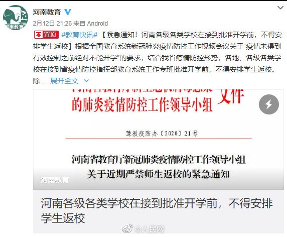 河南教育 緊急通知:各地、各級、各類學校在接到省疫情防控指揮部教育系統(tǒng)工作專班批準開學前,不得安排學生返校。除需要返校參加本校疫情防控工作的教職工外,不得安排其他教職工返校。開學時間以正式批準的方案為準。